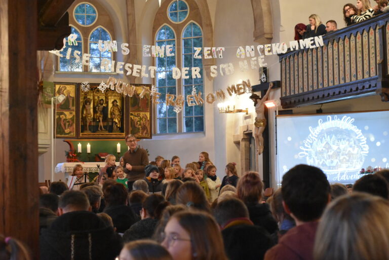 Die Kirche ist mit vielen kleinen Engeln aus Papier geschmückt, die am Fenster stehen. Alle lauschen gespannt den ersten Tönen der Musik. Die Melodie des