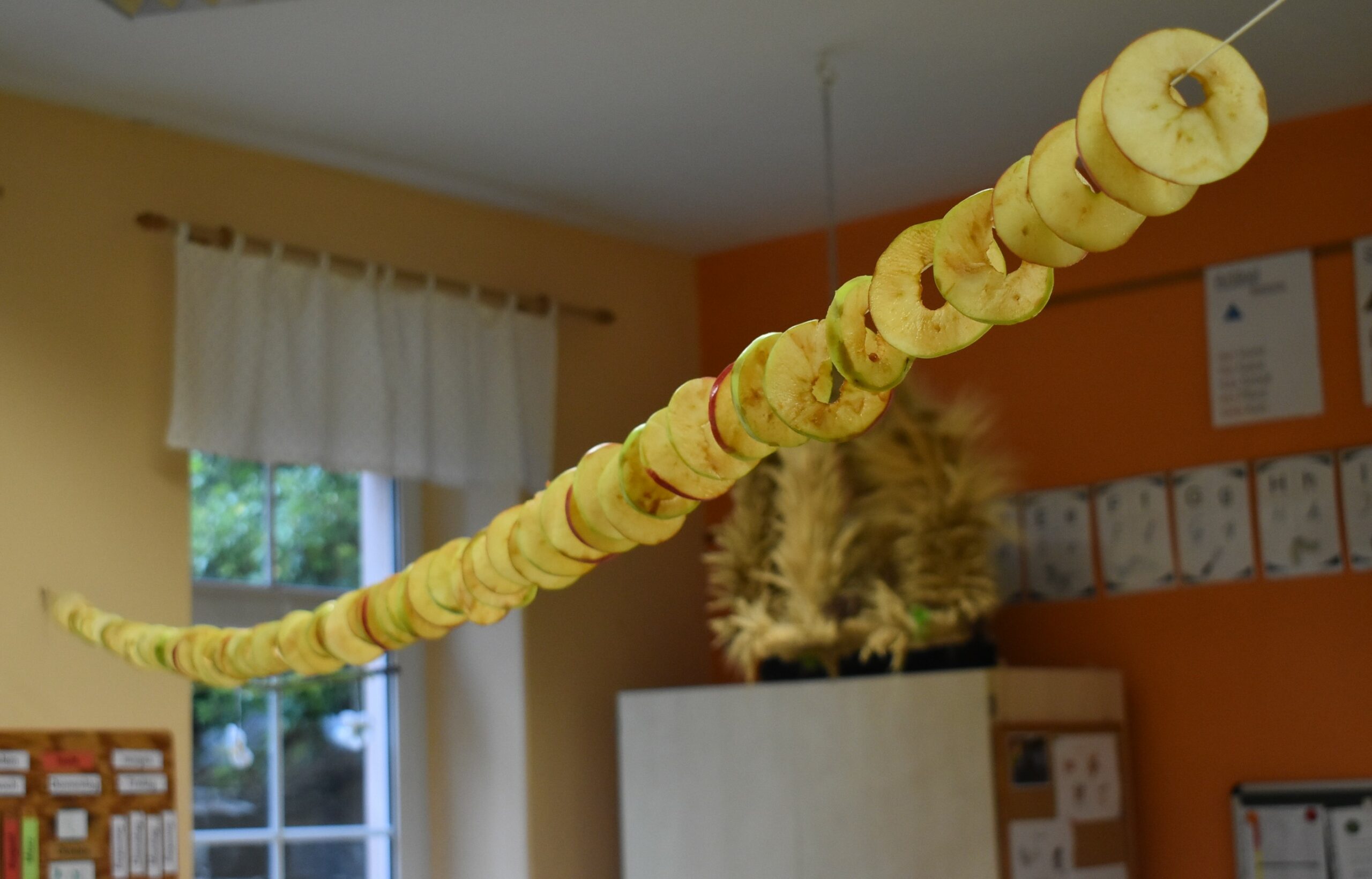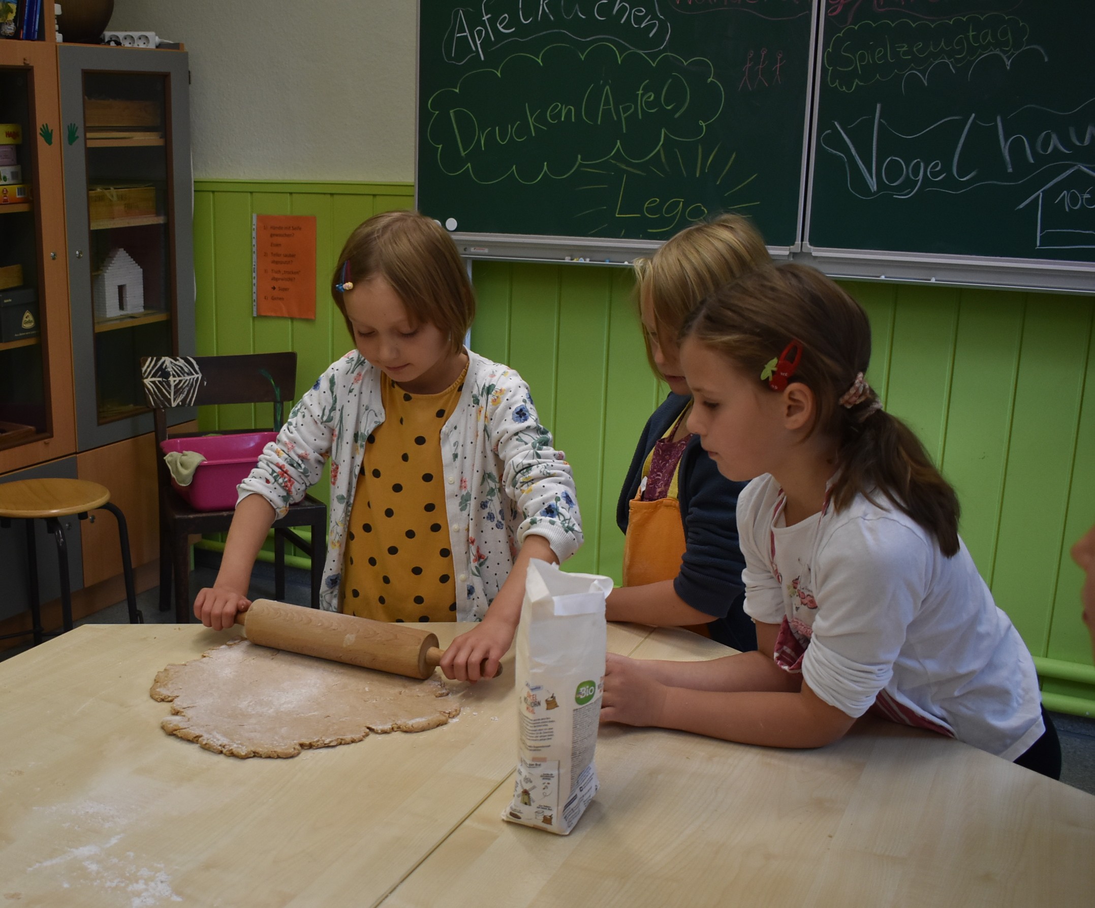 In den Herbstferien war die Fülle der diesjährigen Obsternte ein großes Thema. Vor allem der Apfel, von welchem es allein in Deutschland etwa 2000 verschiedene Sorten geben soll, war Thema im Hort. Es wurde Apfelkuchen gebacken, Apfelringe zum Trocknen geschnitten, Apfelgelee gekocht und Äpfel aus Stoff genäht.